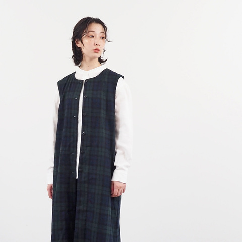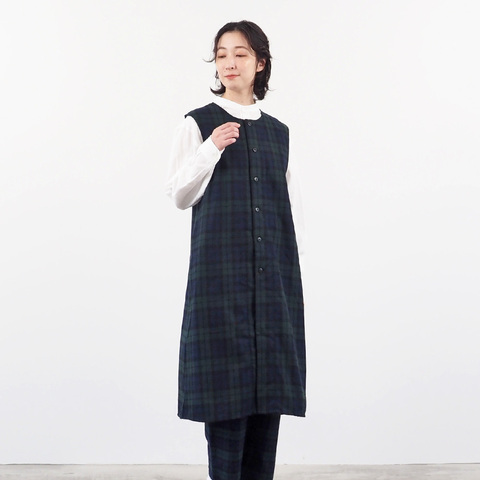すとんとしたIラインシルエットが印象的な正面デザイン。前開き仕様なので、ジレとして羽織るのはもちろん、ワンピース風にも楽しめます。