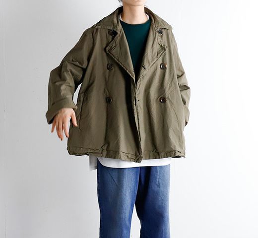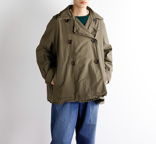 Veritecoeur 新作のライトアウター。コットン100%の生地のダブルボタンのショートコートです。張りのある独特な風合いが魅力の1着です。後ろ身頃にはボックスタックを施し、広がりのあるシルエットが表情豊かな1着です。同素材を使用したダブルボタンのロングコートもございます。 裏地はついておりません。