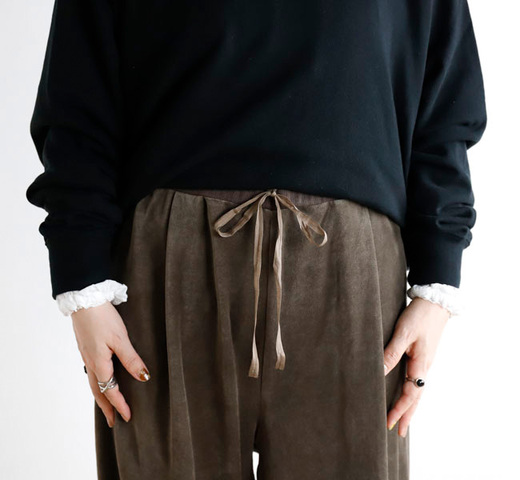 ウエストはタック、ゴムとヒモのシャーリング仕様です。脇のポケット口と裾に配色のパイピングを施しています。インナーパンツとしてもバランスをお楽しみいただけます。