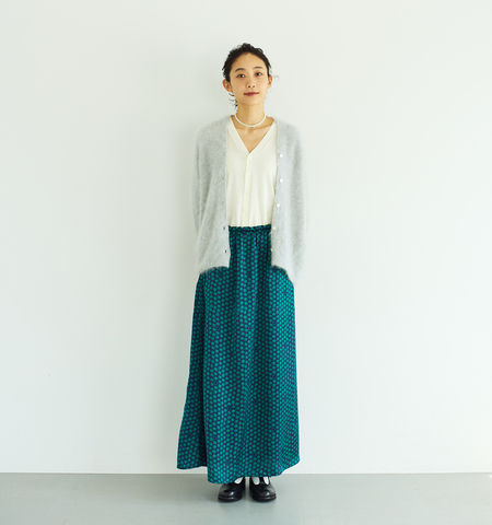その記憶をなぞるようにたどり着いたのが、レトロで幾何学的な花柄プリントと、シルクライクな生地。