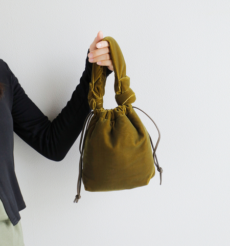 光沢の美しいベルベット素材を使った巾着バッグです。ころんとした巾着の形と、上品なベルベットが秋冬らしいトレンド感を演出します。コンパクトなサイズ感ですが、折り畳み財布・スマートフォンなどおでかけに必要な荷物が入るサイズ感。華やかな素材がフェミニンで、アクセサリー感覚で持つのもオススメです。