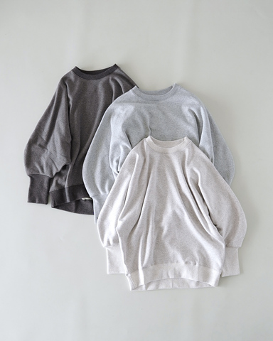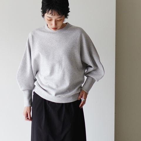 寒い季節を快適に過ごせる裏起毛仕立てのスウェットトレーナー。丸みを帯びたドルマンスリーブとカーブした袖のラインが女性らしい柔らかさを引き立て、長めのカフスは手元を華奢に見せながら全体に上品なバランスを与えます。