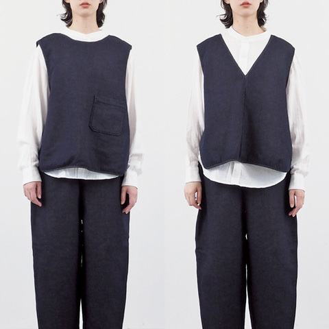 Vネックとクルーネック、気分やコーディネートに合わせて前後どちらでも着られる2WAY仕様。シンプルな白シャツやタートルネックに重ねるだけで、印象を変えて楽しめます。