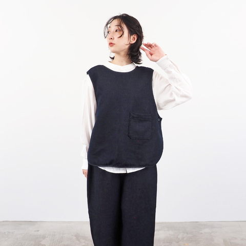 前後2WAYで楽しめる着回し力が魅力のムラデニム裏起毛 フリップベストです。デニム素材の表情はそのままに、内側は柔らかな裏起毛仕立て。軽やかな着心地なのに、冬までしっかり暖かく包み込んでくれます。