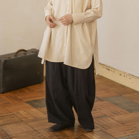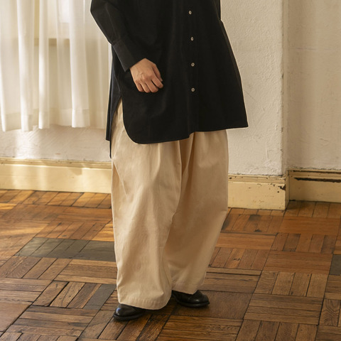 前後に入れた深めのタックとギャザーが立体感を生み、ワイドながらも美しくまとまり、穿くだけで“様になる”一本です。