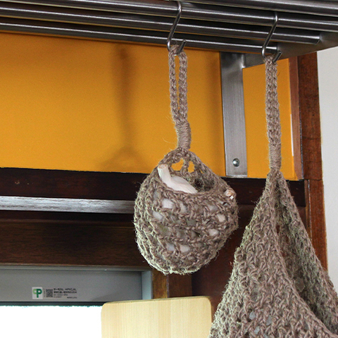 にんにくや玉ねぎなどの常備野菜を通気良く収納でき、キッチンに吊るすだけで心地よいナチュラルな雰囲気を添えてくれます。