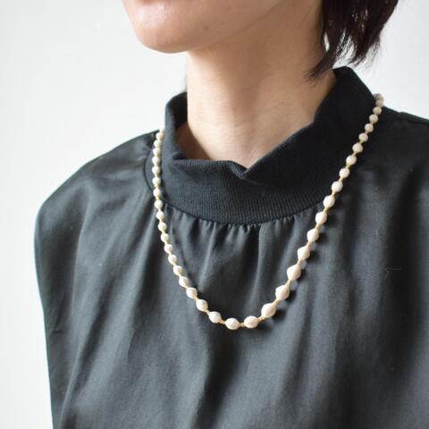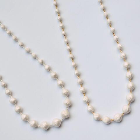 5mm~9mmサイズのアイボリー色の糸玉がラメの糸で連なっているので、キュプラの糸玉が浮かび上がり、落ち着きがありながらも華やかな印象に仕上がっています。