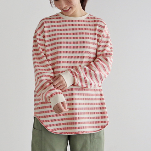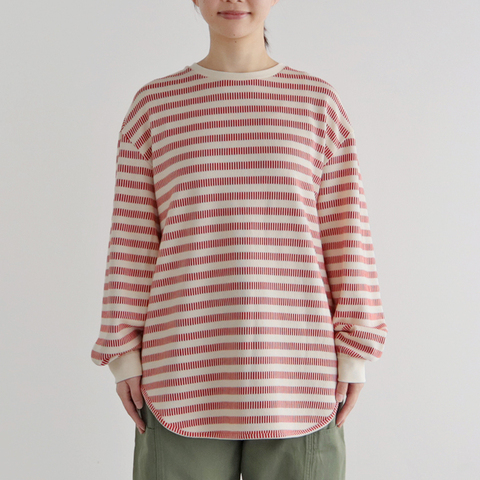 生地にはさらっとした風合いが心地良いドミノボーダーを採用。リブ編みのような細畝に沿ってボーダーを施すことで独特の柄を表現しています。軽やかな着用感でデイリーに活躍するアイテムです。