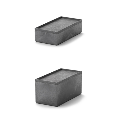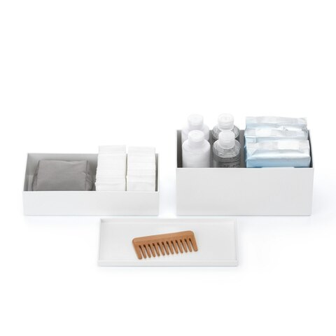 縦でも横でも使える為、置きたい場所の奥行きに合わせられるのも便利なところ。組み合わせのできるボックス2型とインナー2型、それぞれのフタになるトレーの展開です。