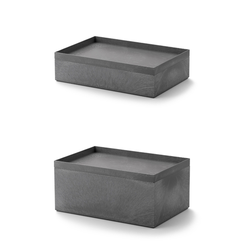 縦でも横でも使える為、置きたい場所の奥行きに合わせられるのも便利なところ。組み合わせのできるボックス2型とインナー2型、それぞれのフタになるトレーの展開です。