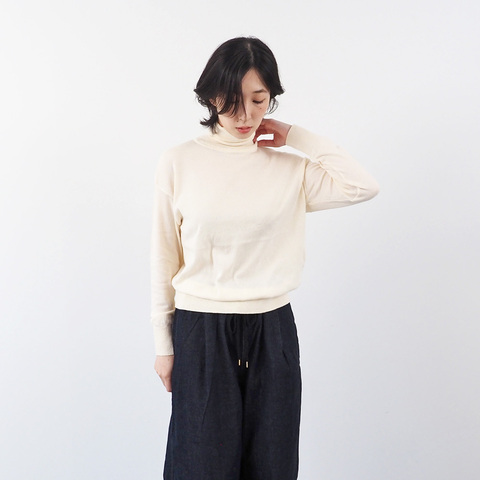 細い綿糸に特別な起毛加工を施した、NARUだけのオリジナル糸を使用したムースヤーン タートルネックニットです。シンプルなのにどこか女性らしさを感じさせるタートルニット。首元をやさしく包み込み、すっきりとした印象に仕上げてくれます。