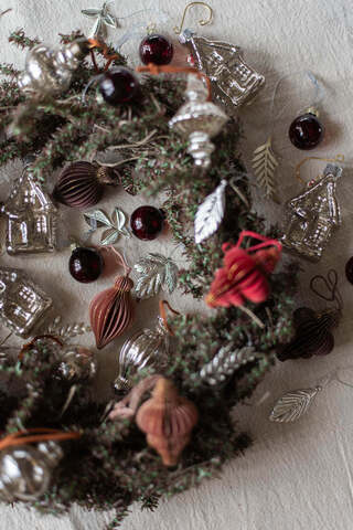 同系色のオーナメントとの相性はもちろん、ガラスオーナメントなど質感の異なるアイテムとも自然に調和するので、どんなシーンにも取り入れやすく、プラスワンとしてもおすすめです。