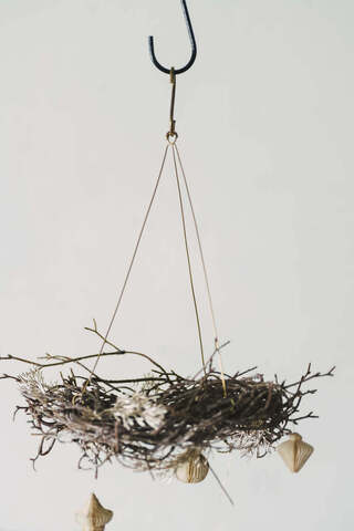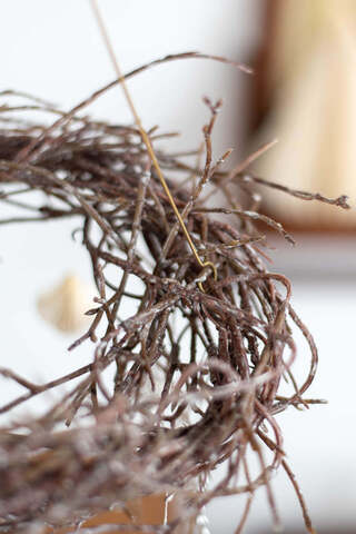お気に入りのオーナメントやリース、モビールを吊るすなら、フックにもこだわりを。天井から吊るすフライングリースやモビールなどを支える真鍮製のフックは、細く華奢ながら上品な光沢を放ち、飾るものの存在感をいっそう引き立てます。