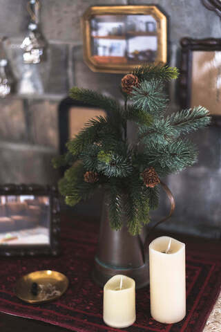 「Feurie No.15」のためにセレクトした、ブルーウォッシュパインと松かさ付きパインのアソートセット。 異なる質感と色合いの2種類が重なり合い、立体感のある冬のディスプレイを叶えます。