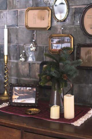 「Feurie No.15」に挿せば、ホワイト塗装を施したガラスとパインの枝が映えて、温かみがありながらもクールな雰囲気に。ヴィンテージ家具やモダンな空間にも相性抜群です。