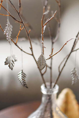 薄いメタルで作られた葉は、葉脈が細かく型押しされており、光を受けると柔らかく反射して表情を生み出します。繊細なシルバーの吊り紐が付いているため、主張を抑えながらリーフそのものの存在感を引き立てます。枝から吊るしたり、ツリーやリースにまとめたり、ガーランドに散らしたりと使い方は自由自在。