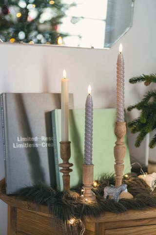 本物のワックスを使用したクラシックな佇まいに、ツイストデザインを施したスパイラルフォルムが映えるLEDキャンドル。やさしい光が揺らめき、本物のキャンドルのような雰囲気を演出します。