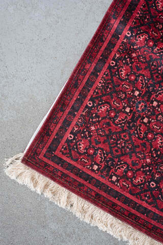 ラグ全体のデザインは、トルコやトライバルラグに見られる自然物の紋様をモチーフに、落ち着いたヴィンテージライクな雰囲気を再現。くっきりとした黒の模様がボルドー調の赤を引き締め、メリハリを生みつつ上品さを保っています。