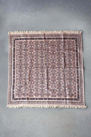 ラグ全体のデザインは、トルコやトライバルラグに見られる自然物をモチーフに、落ち着いたヴィンテージライクな雰囲気を再現。濃いめのブラウンや黒の模様が柔らかいベージュを引き締め、メリハリを生みつつ上品さを保っています。