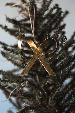 柔らかな丸みとシャープな直線の対比が美しいリボン型オーナメント。薄い鉄板をくるりと成形した立体感が、光の角度で表情を変え、空間にさりげなく上品な存在感を添えます。