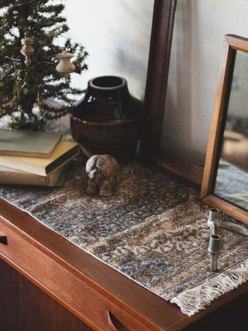 キャビネットやテーブルランナーとして、幅広いインテリアに馴染む色合いに仕立てました。ガラスや木製、紙製など多様な素材感のアイテムとも調和してくれます。