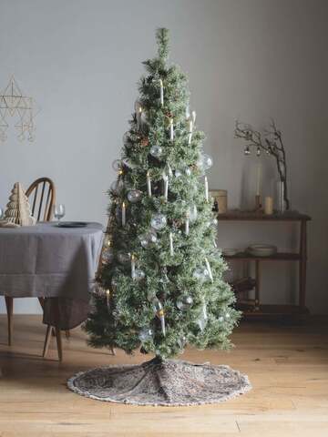 生地はコットン70%の優しい風合い。太めの糸が生む秋冬らしい重みのある質感があります。裾のフリンジも陰影を付けてくれるので、立体感のある豊かなクリスマスコーディネートを楽しめます。長年使い込まれたような生地のように物語を感じさせる、ヴィンテージライクなインテリアがお好きな方へもおすすめのツリースカートです。