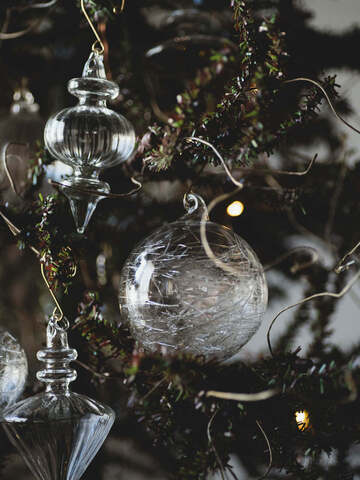 光を受けて輝く透明度の高い上質な輝きは、ガラス素材ならでは。完全無色のクリアカラーに仕立てても凛とした上質な雰囲気が出せるのは、職人の手仕事技術があるからこそ。制作過程で生まれる揺らぎや気泡もオーナメントの優美な佇まいを一層引き立てます。