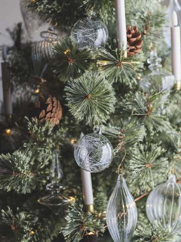 光を受けて輝く透明度の高い上質な輝きは、ガラス素材ならでは。完全無色のクリアカラーに仕立てても凛とした上質な雰囲気が出せるのは、職人の手仕事技術があるからこそ。制作過程で生まれる揺らぎや気泡もオーナメントの優美な佇まいを一層引き立てます。