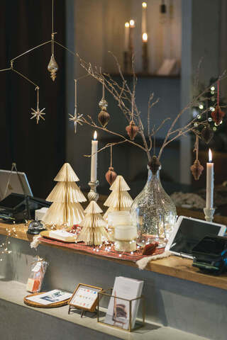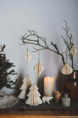 カラーはやさしいオフホワイトで、明るく温かみのある空間を作り出します。ハニカムペーパーの縁には控えめなブロンズカラーのラメをあしらい、さりげなく華やかさも。直線的でシャープなシルエットは、クリスマスのコーディネートにすっきりとしたアクセントを加えます。