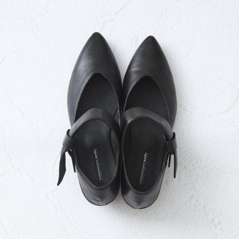 甲部分がV字にカットされているパンプスは、幅広のベルトが目を惹いてモードな印象です。甲の部分が浅いパンプスは、女性らしさはあるものの、脱げやすいのが難点。でも、こちらは幅広のベルトのデザインにすることで、足とパンプスをしっかりと固定してくれます。