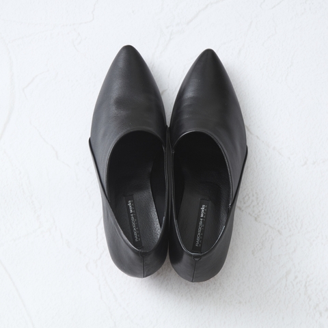 足と靴がちゃんとフィットして歩きやすいようにと、甲部分は深めです。足入れ部分をアシンメトリーにしているので、履いたときにすっきりとして見えるのもポイント。どんなボトムスに合わせても重く見えず、バランスが取りやすいと思います。