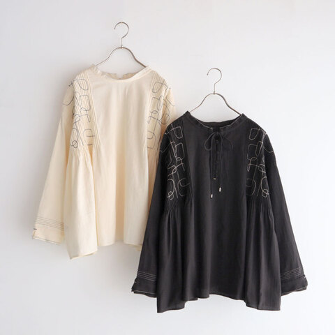 幾何学模様の刺繍と繊細なピンタックが存在感を放つ「tumugu: (ツムグ)」のブラウスです。