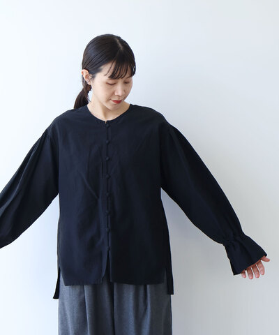 袖口にギャザーをたっぷり入れた、ノーカラーデザインシャツ