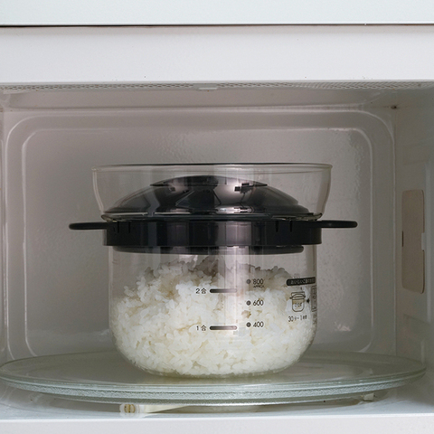 お米と水を入れ、電子レンジでチンするだけで簡単にお米が炊ける、ガラスのご飯釜。