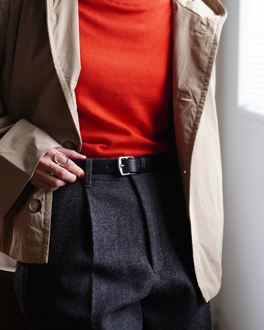 無駄のない1インチ幅のシルエットに、シルバーバックルが上品な印象を添えるデザイン。使うほどに柔らかく馴染み、深みのある風合いへと育つ一本です。