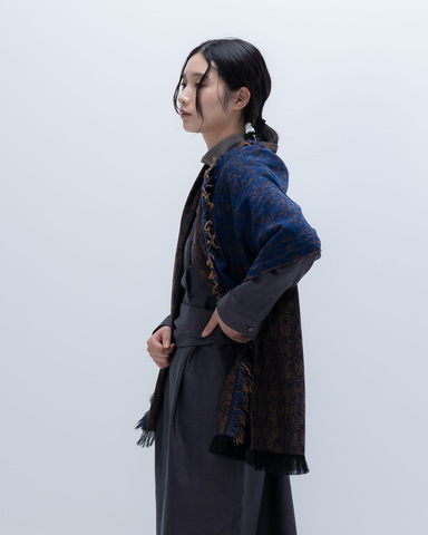 色づき始めた山の木々や日の色によって変化する街の景色、鳥から見た里山、ぼんやりと心の中に残る愛おしい風景をモザイクのようにぼんやりと表現しています。 そんな景色とともに感じる、ウールのマフラーはこれからの肌寒くなる季節にそっと首元に優しさとあたたかさを感じることのできるアイテム。