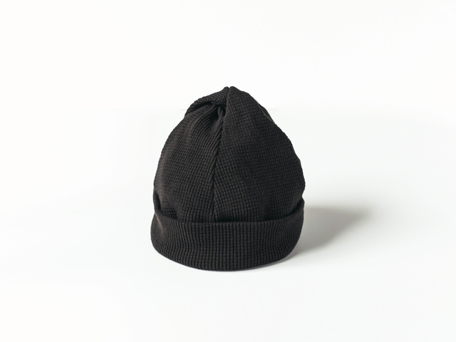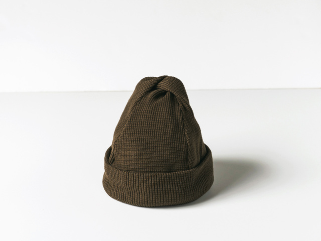てっぺんをくるりとねじって縫い留めた、tatamize(タタミゼ)の「TWIST COTTON KNIT CAP」。