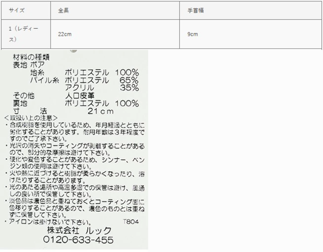 表地:(ボア 地糸)ポリエステル100% (パイル糸)ポリエステル65% アクリル35% (その他)人工皮革