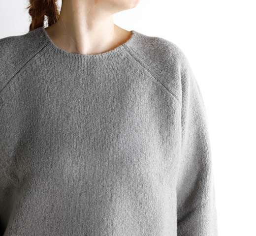 定番のプレスウールシリーズから残る端材を粉砕して、新たな糸に生まれ変わったrenew-wool。今季はウールの連続した細かいループ糸と組み合わせ、編地に密度がありながら、軽さと暖かみのある糸で製作。ゆったりとした仕立てで、空気を含みあたたかく着ていただけます。