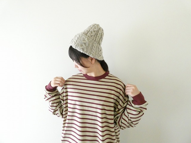 メキシコ産のタコスコットンを使い、先染めのボーダー柄を少し目を詰めて、丁寧に編み上げています。糸にはふっくらとしたふくらみがあり、やさしい風合いが魅力。ほどよい厚みとハリ感があるので、型くずれしにくく、きれいなシルエットをキープしてくれます。