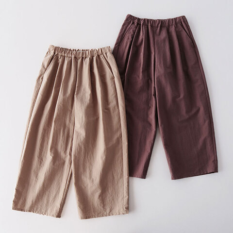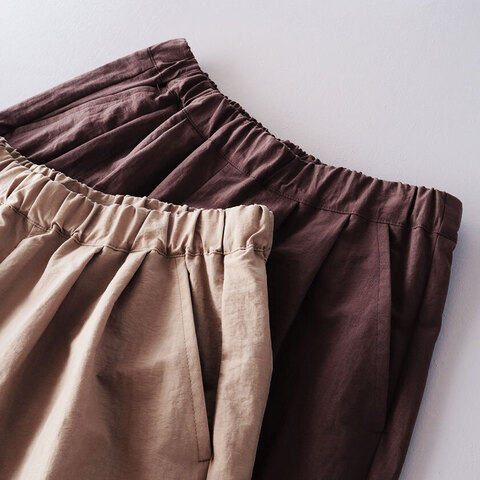 フロントにタックを入れることで生まれる、ゆとりがありながらもワイドすぎない絶妙なシルエットが魅力。さりげなく体型カバーをしつつ、まっすぐ縦に落ちるラインが上品な印象を与えます。足首が見え隠れするクロップド丈もデザインのポイント。ウエストは総ゴム仕様で、内側には簡単にサイズ調節できるドローコードが付いています。