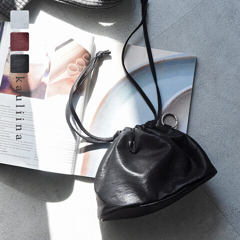 くたっと柔らかく手に馴染む、フェイクレザー素材の巾着ポーチ。バッグインバッグとして小物を整頓したり、トートバッグの目隠しにしたり。そのまま持って巾着バッグとしても使える上品な印象に仕上げました。