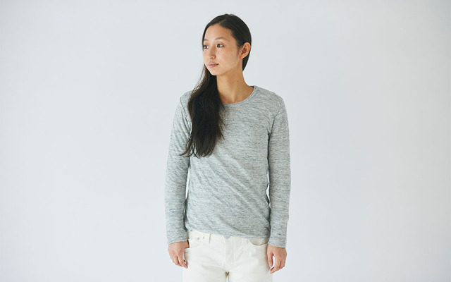 「リネン」という素材に対して、張りや固さのあるイメージを持たれる方も多いかと思いますが、麻の種類、糸の品質、織りや編みの生地製作時の質によります。高品質な糸と、リネンニットという技術による、柔らかくなめらかな質感です。着て、洗っていただくと、より柔らかくなってきます。