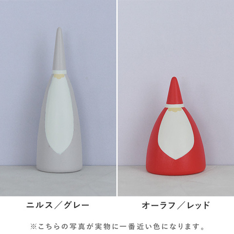 実はこの2人には名前があります。グレーのサンタは「ニルス」、赤いサンタは「オーラフ」。クリスマスのお部屋に一緒に並べてあげたい、仲良しサンタの木のオブジェです。