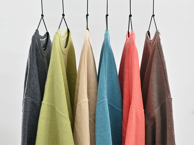 ・ガーメントダイ(染料製品染め)で染色することで、ムラ感のある独特なカラーリングを表現。