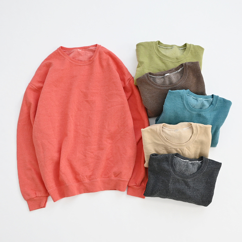 こちらは、ガーメントダイ(染料製品染め)を施したクルーネックスウェット。程よい厚みと、製品染めならではのムラ感のある独特な風合いを気軽に楽しめます。イージーでちょっと雑でチープ感じが、ザ・アメリカンカジュアルって感じで、クラシカルでスポーティでラフな雰囲気に仕上がっています。お揃いのスウェットショーツとのセットアップもおすすめです。