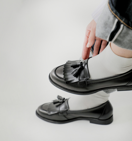 伝統的なキルトデザインにタッセルをあしらったクラシカルなアッパーデザイン。さりげなく揺れるタッセルが足元に動きを加え、歩くたびに女性らしい柔らかさを演出します。