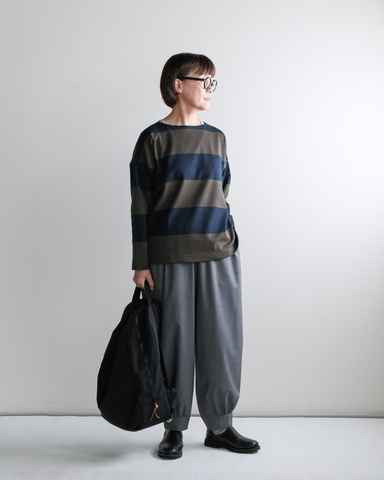 太めのシックなボーダーは落ち着いたパンツと合わせて大人っぽく。
