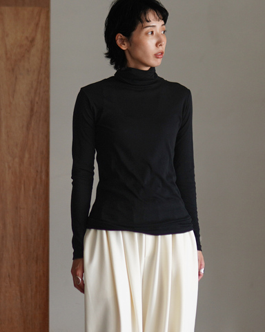 肌に心地よく寄り添う柔らかなフライス地が魅力のカットソー。ねじりを加えたタートルネックがさりげなく立体感を生み、シンプルな装いにほどよいニュアンスを添えます。