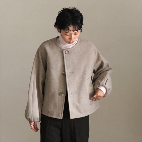 顔まわりをすっきりと見せるノーカラーデザインに、ボリュームスリーブが女性らしさをプラス。フロントの大きめボタンがクラシックな表情を添え、両サイドには実用的なウェルトポケットを配置。